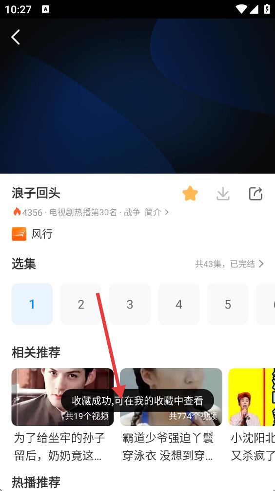 4、圖標(biāo)變?yōu)辄S色,同時會彈出收藏成功,說明電視劇收藏成功。