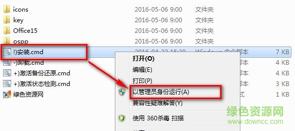 1.在綠色資源網(wǎng)下載并解壓縮,找到“!)安裝.cmd”右鍵選擇“以管理員身份運(yùn)行”