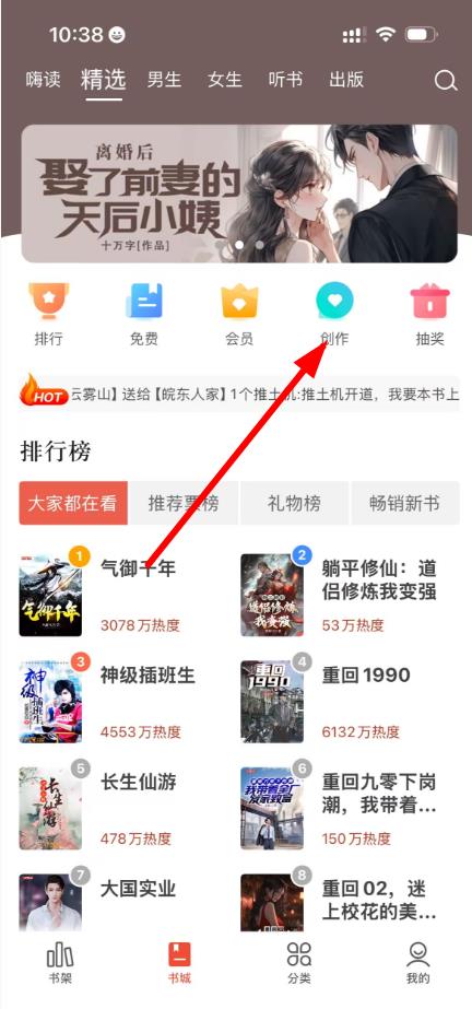 1、打開(kāi)17k小說(shuō)APP,進(jìn)入首頁(yè)界面,點(diǎn)擊底部導(dǎo)航欄中的書(shū)城,然后在書(shū)城界面上方的功能選項(xiàng)中,找到并點(diǎn)擊創(chuàng)作按鈕。