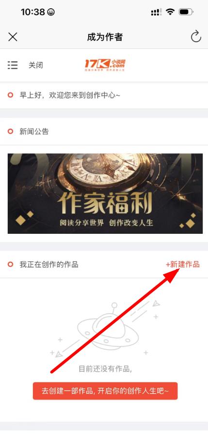 2、點(diǎn)擊創(chuàng)作后,會(huì)進(jìn)入成為作者頁(yè)面,即創(chuàng)作中心,在我正在創(chuàng)作的作品區(qū)域,點(diǎn)擊+新建作品。