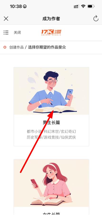 3、進(jìn)入創(chuàng)建作品頁(yè)面,根據(jù)自己的創(chuàng)作方向,選擇作品受眾類(lèi)型,比如男生長(zhǎng)篇或者女生長(zhǎng)篇,之后按照頁(yè)面提示填寫(xiě)作品的相關(guān)信息,如書(shū)名、簡(jiǎn)介等,即可開(kāi)始創(chuàng)作。