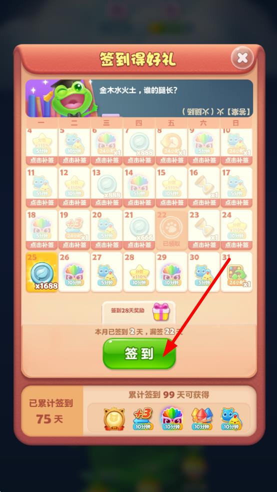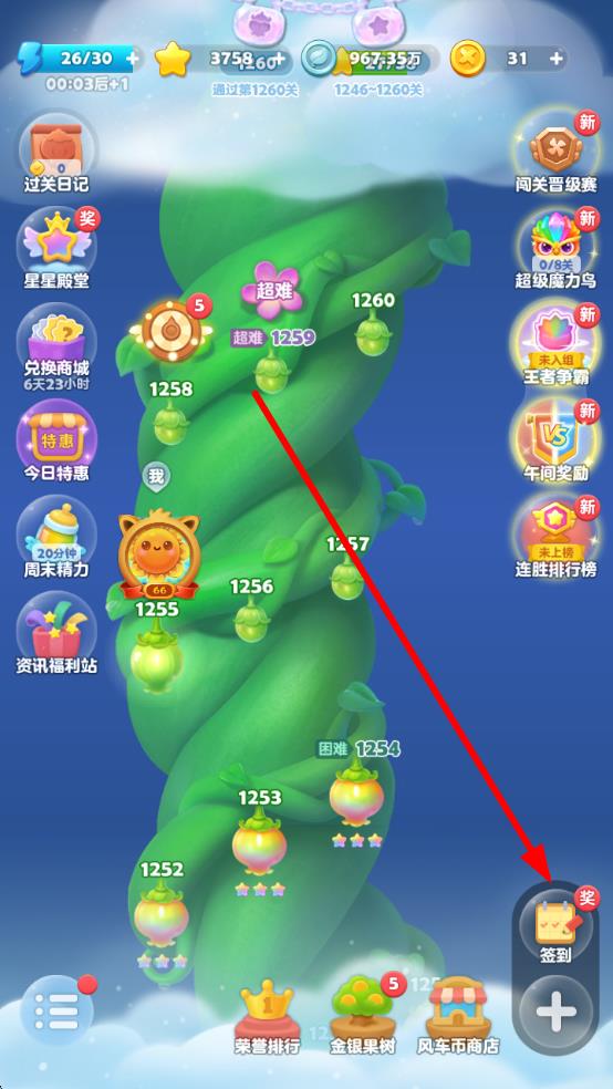 1、打開開心消消樂游戲,在游戲主界面點擊右側(cè)的簽到圖標,進入簽到界面。