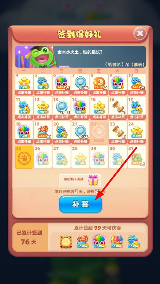 3、若有漏簽情況,在簽到界面下方點擊補簽按鈕,按要求操作完成補簽,獲取相應獎勵。