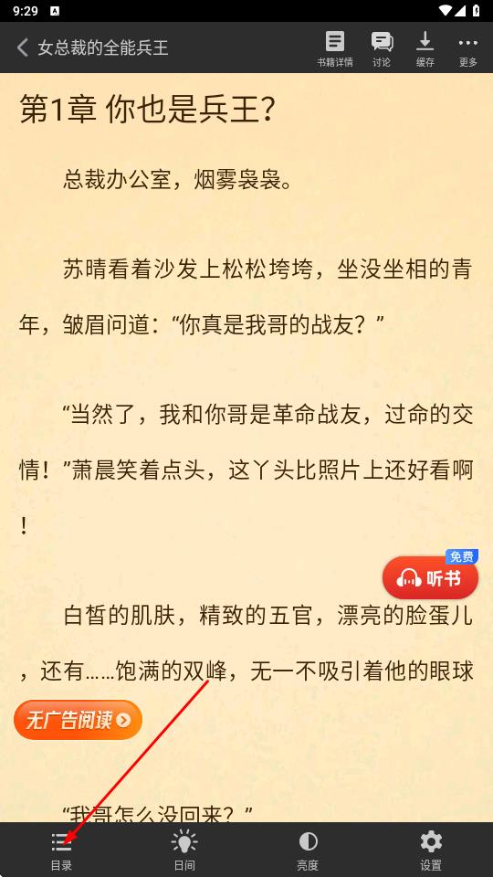 1、閱讀女總裁的全能兵王時(shí),點(diǎn)擊左下角目錄可查看章節(jié)列表,也能點(diǎn)擊聽書功能聽書閱讀。