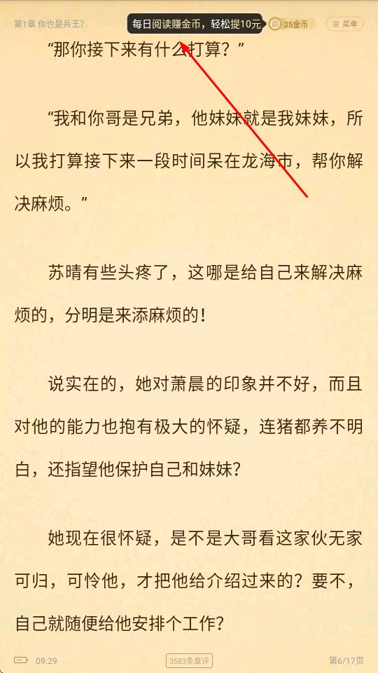 2、閱讀小說過程中,頂部出現(xiàn)每日閱讀賺金幣,輕松提10元提示,可參與活動(dòng)獲取金幣。
