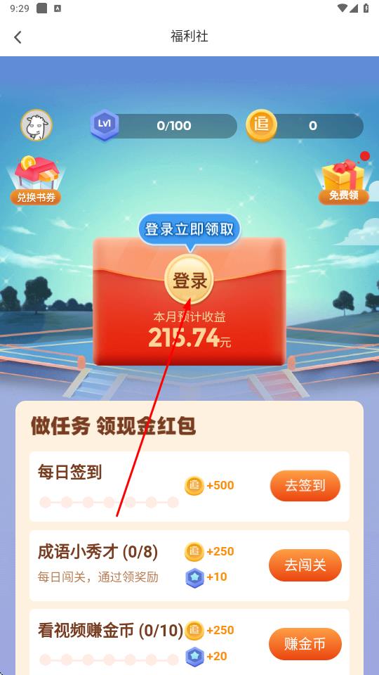 3、進(jìn)入福利社頁(yè)面,點(diǎn)擊登錄領(lǐng)取本月預(yù)計(jì)收益,還能完成任務(wù)領(lǐng)取現(xiàn)金紅包即可提升等級(jí)。