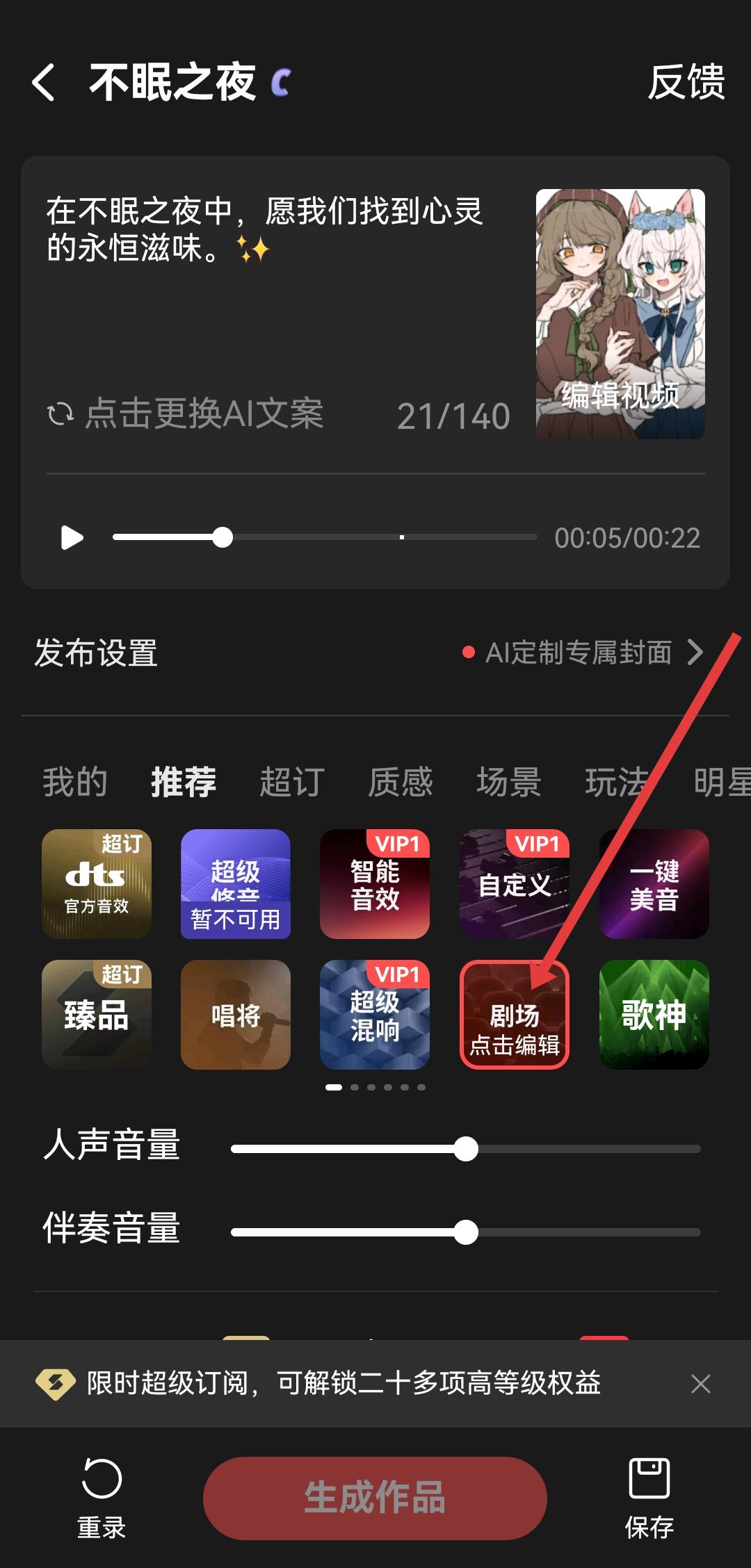 1、錄制完成后,在發(fā)布設(shè)置界面,點(diǎn)擊劇場(chǎng)的點(diǎn)擊編輯,可進(jìn)入音效編輯,挑選適配歌曲風(fēng)格的劇場(chǎng)音效。