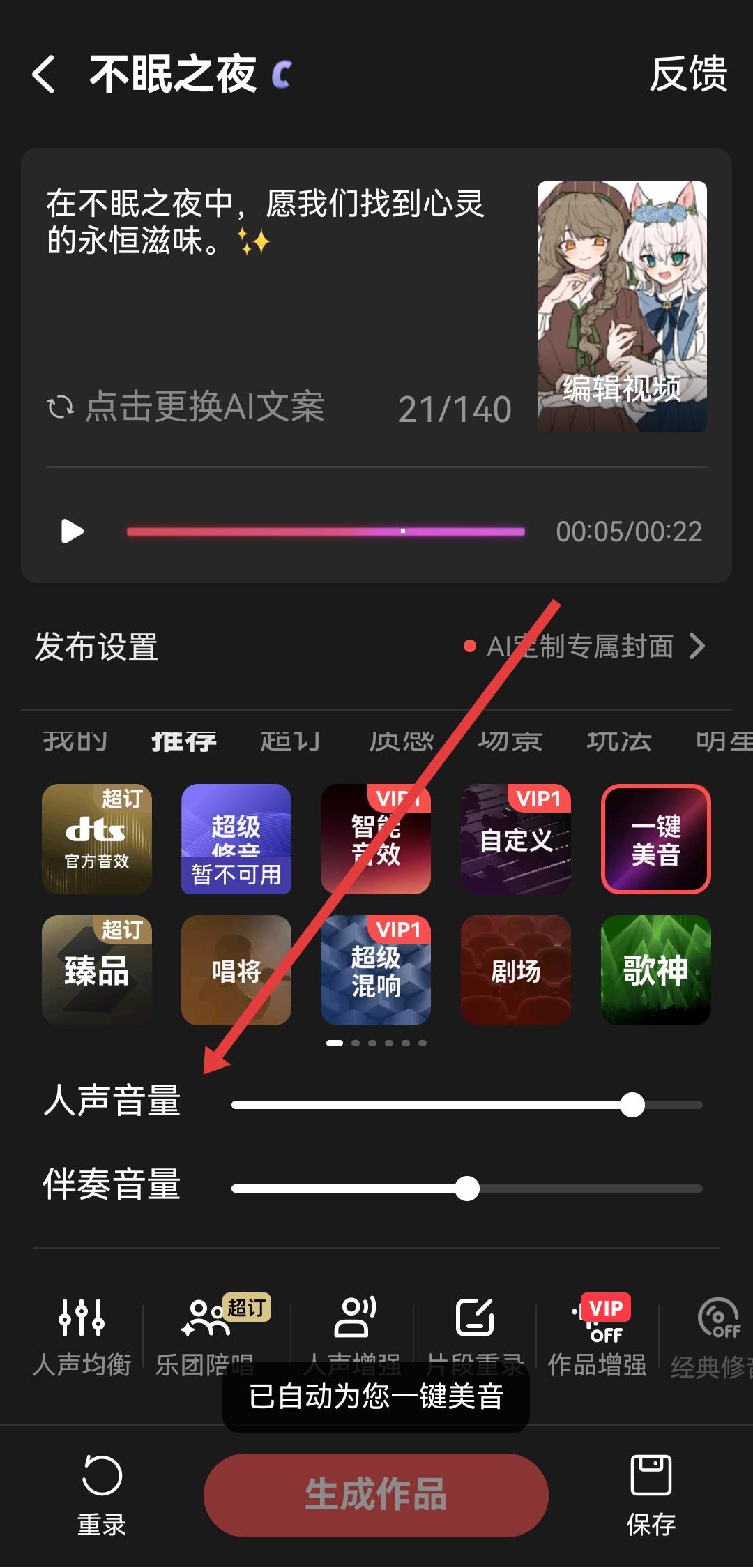 2、調(diào)節(jié)人聲音量和伴奏音量,根據(jù)個(gè)人演唱情況,適當(dāng)提高人聲音量,使人聲突出,與伴奏達(dá)到和諧平衡。