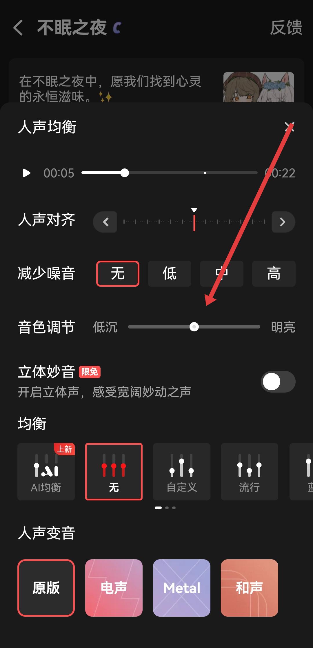 3、點(diǎn)擊人聲均衡,在調(diào)節(jié)界面中,通過(guò)調(diào)整音色調(diào)節(jié)滑塊,依據(jù)自身聲線(xiàn),往低沉或明亮方向調(diào)節(jié),優(yōu)化音色。