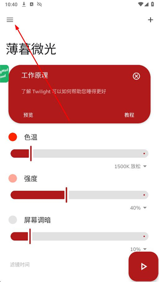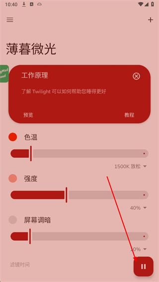 薄暮微光(Twilight)應(yīng)用使您的設(shè)備屏幕適應(yīng)一天中的時間推移。它會在日落后過濾掉您手機或平板電腦屏幕上的藍色光譜,并以柔和而悅目的紅色濾鏡來保護您的眼睛。濾鏡的強度會根據(jù)您所在地日出與日落時間的日照周期而平滑地調(diào)節(jié)。