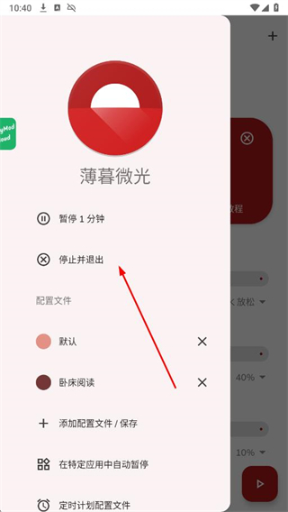 3、在側(cè)邊欄中點擊停止并退出,即可徹底關(guān)閉薄暮微光APP。