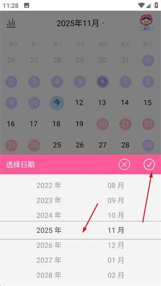 3、在彈出的選擇日期界面中,選擇要查看的年份和月份,點擊右側(cè)的對勾按鈕。