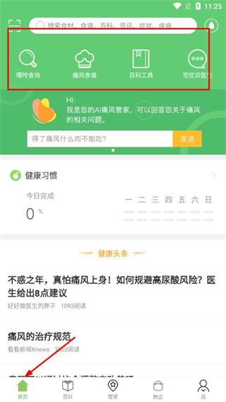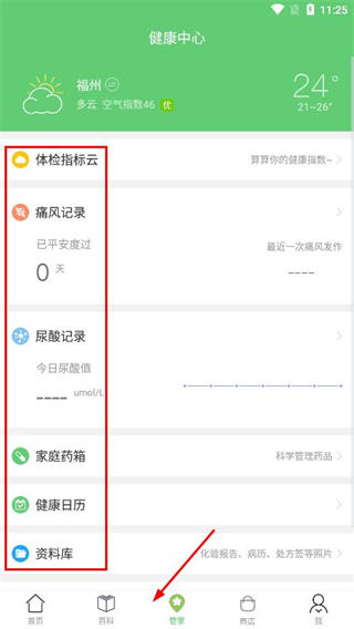 3、管家板塊設(shè)有體檢指標(biāo)云、痛風(fēng)記錄、尿酸記錄、家庭藥箱、健康日歷、資料庫(kù)等功能,可記錄痛風(fēng)發(fā)作情況、尿酸數(shù)值,管理家庭藥品,查看健康日歷及存儲(chǔ)醫(yī)療資料。