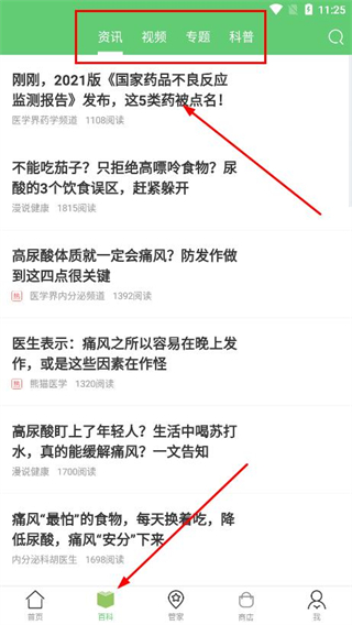 2、百科板塊包含資訊、視頻、專(zhuān)題、科普等分類(lèi),提供豐富的痛風(fēng)防治、高尿酸管理等健康知識(shí)內(nèi)容,幫助用戶了解疾病相關(guān)信息。