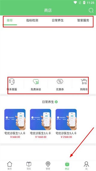 4、商店板塊有推薦、指標(biāo)檢測(cè)、日常養(yǎng)生、管家服務(wù)等分類(lèi),提供聯(lián)系客服、免費(fèi)體驗(yàn)、優(yōu)惠券、購(gòu)物車(chē)等服務(wù),還可購(gòu)買(mǎi)宅優(yōu)診醫(yī)生卡等健康服務(wù)產(chǎn)品。