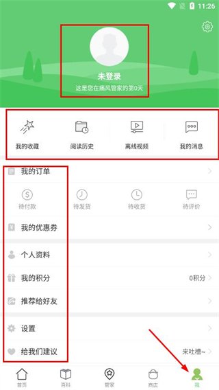 5、我的板塊可進(jìn)行登錄,管理我的收藏、閱讀歷史、離線視頻、我的消息,處理訂單,查看優(yōu)惠券、個(gè)人資料、積分,進(jìn)行推薦好友、設(shè)置及反饋建議等操作。