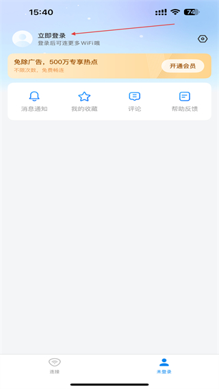 1、打開wifi萬能鑰匙APP,進(jìn)入到首頁內(nèi),點(diǎn)擊下方未登錄的按鈕。