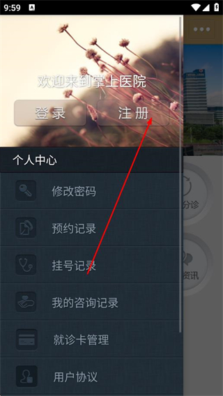 打開軟件后,點(diǎn)擊左上角按鈕(紅框位置),再點(diǎn)擊注冊(cè),輸入您的手機(jī)號(hào)碼,設(shè)置6—16位的密碼,點(diǎn)擊“獲取驗(yàn)證碼”按鈕,將收到的短信驗(yàn)證碼輸入框中,再點(diǎn)擊“注冊(cè)”。