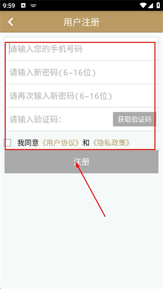 3、輸入手機(jī)號(hào)碼、密碼、驗(yàn)證碼,勾選協(xié)議,點(diǎn)擊注冊(cè)。