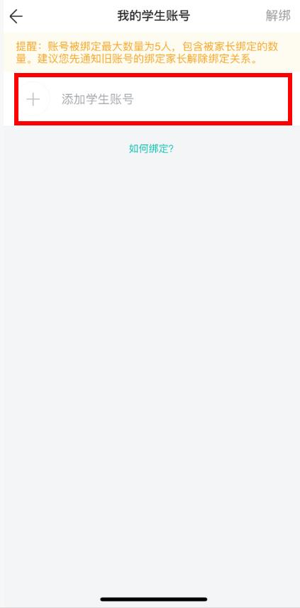 3、進入我的學生賬號頁面后,點擊+添加學生賬號,按后續(xù)提示完成賬號綁定操作。