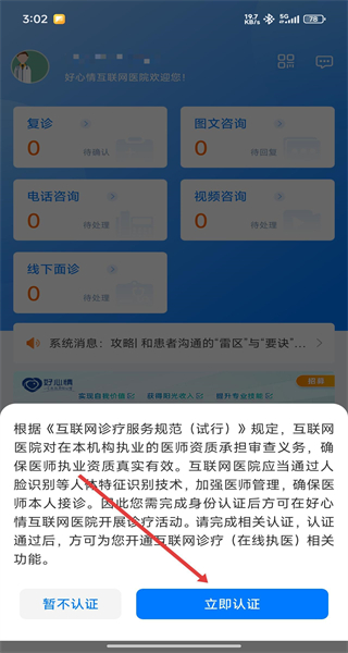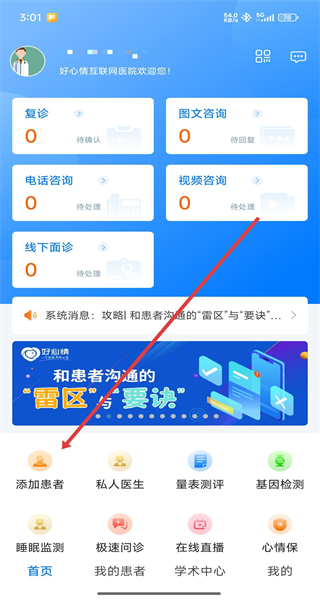 1、在好心情醫(yī)生版APP首頁,點擊添加患者選項,彈出身份認證提示框。