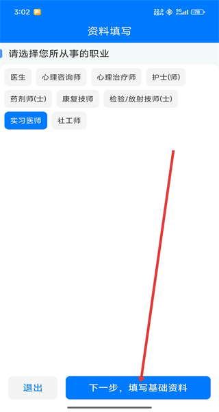3、在資料填寫界面,選擇所從事的職業(yè)如實習醫(yī)師后,點擊下一步,填寫基礎(chǔ)資料按鈕,進入認證須知界面。