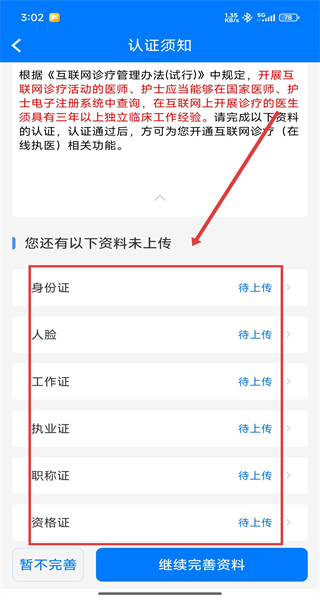 4、在認證須知界面,依次上傳下方個證件資料后,點擊繼續(xù)完善資料按鈕繼續(xù)填寫后續(xù)資料后使用。