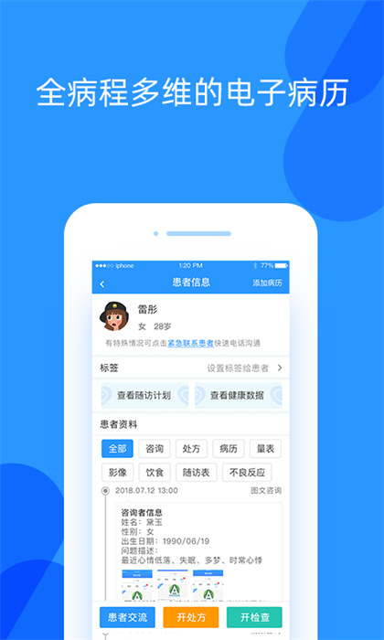 好心情醫(yī)生版的移動互聯(lián)網(wǎng)私人診所為醫(yī)生和患者之間搭建了一座溝通的橋梁,通過圖文、電話等溝通方式與患者保持良好溝通。隨訪功能提供了管理患者、積累患者信息的便捷工具,讓您輕松管理患者,全面掌握隨訪數(shù)據(jù)。