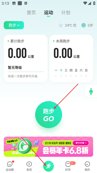 1、打開(kāi)咕咚APP,在首頁(yè)點(diǎn)擊去跑步選項(xiàng)。