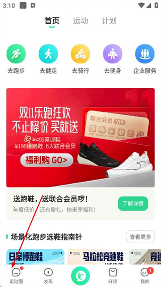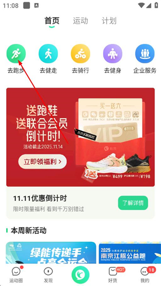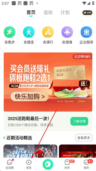1、打開(kāi)咕咚APP首頁(yè),點(diǎn)擊底部發(fā)現(xiàn),進(jìn)入發(fā)現(xiàn)頁(yè)面。