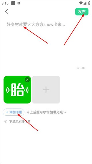 5、輸入文字內(nèi)容,可點(diǎn)擊添加話題,點(diǎn)擊發(fā)布,即可發(fā)布動(dòng)態(tài)。