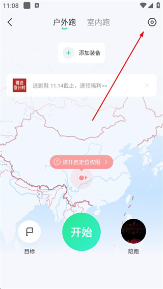 2、在跑步頁(yè)面,點(diǎn)擊右上角設(shè)置圖標(biāo),進(jìn)入運(yùn)動(dòng)設(shè)置頁(yè)面。