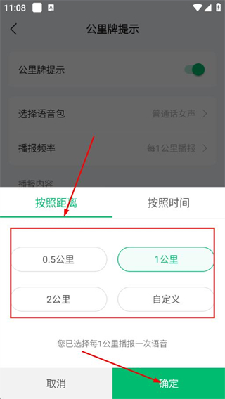 5、可選擇按照距離設(shè)置播報(bào)頻率,選擇后點(diǎn)擊確定完成設(shè)置。