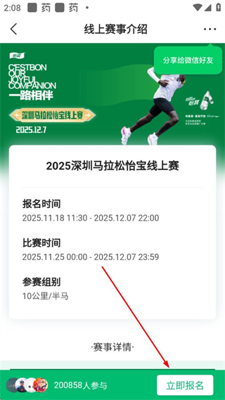 4、在賽事介紹頁(yè)點(diǎn)擊立即報(bào)名,進(jìn)入報(bào)名線上馬拉松頁(yè)面。