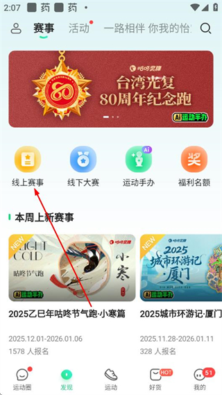 2、在發(fā)現(xiàn)頁(yè)面點(diǎn)擊線上賽事,進(jìn)入線上賽事列表頁(yè)面。