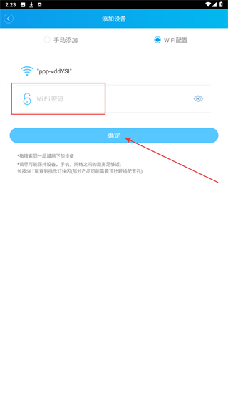 3、在WIFI配置的頁(yè)面內(nèi),輸入WIFI密碼后再點(diǎn)擊確定的按鈕。