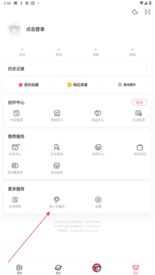 2、進(jìn)入我的頁(yè)面內(nèi),點(diǎn)擊下方青少年模式的按鈕。