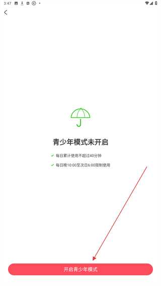 3、進(jìn)入青少年模式的頁(yè)面內(nèi),點(diǎn)擊下方開(kāi)啟的按鈕。