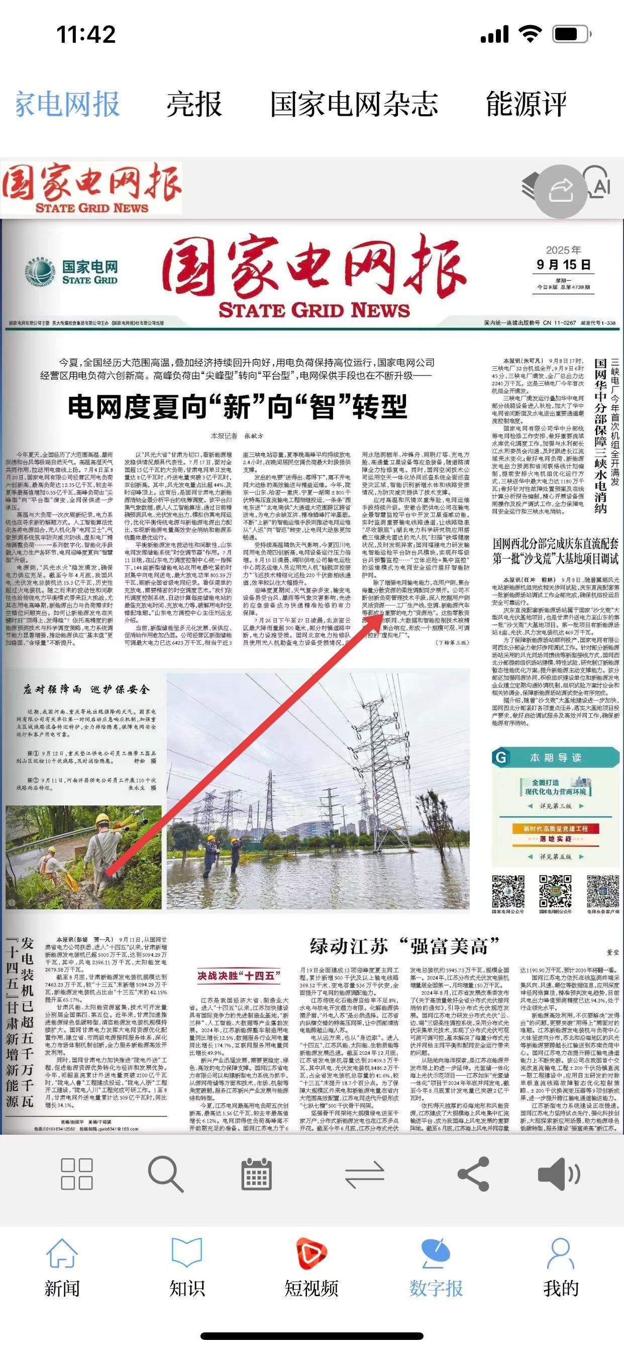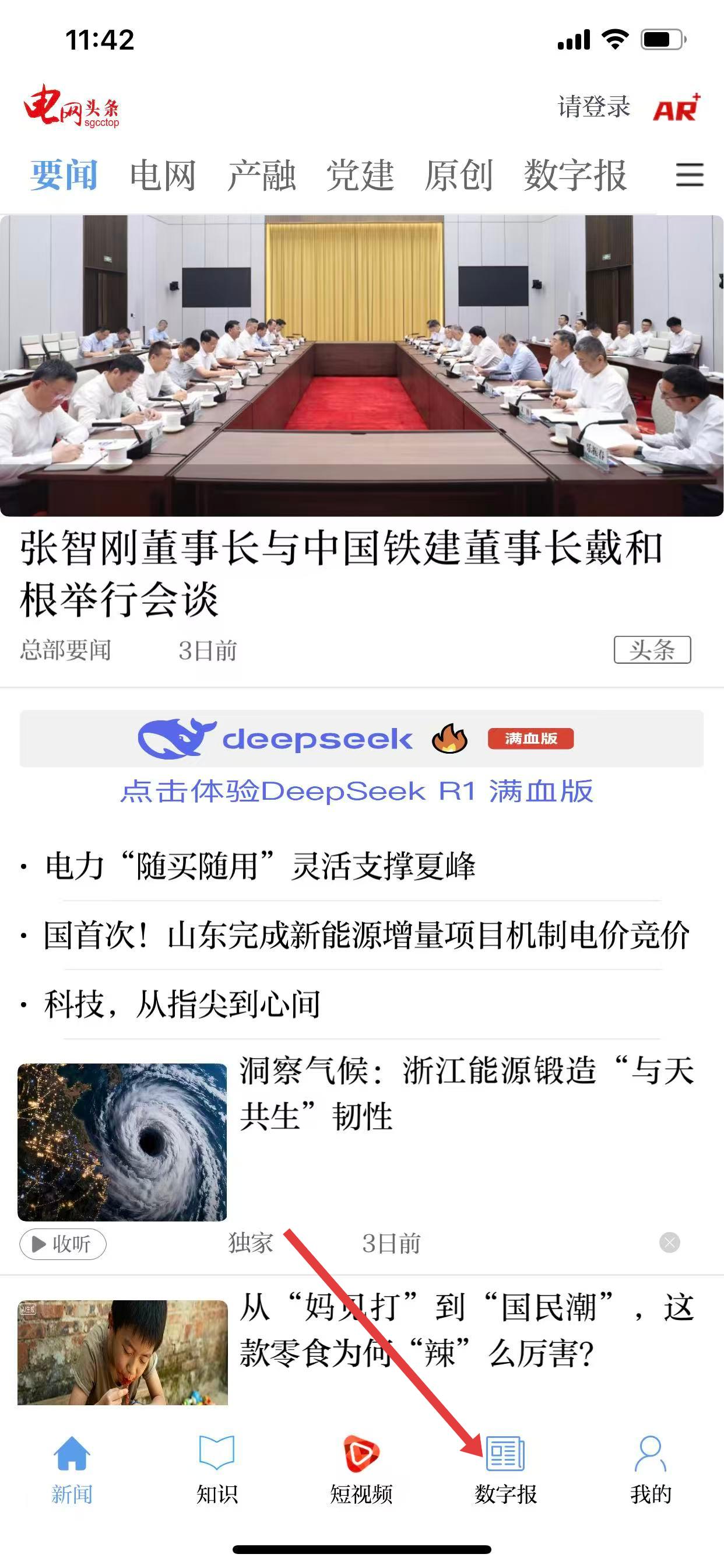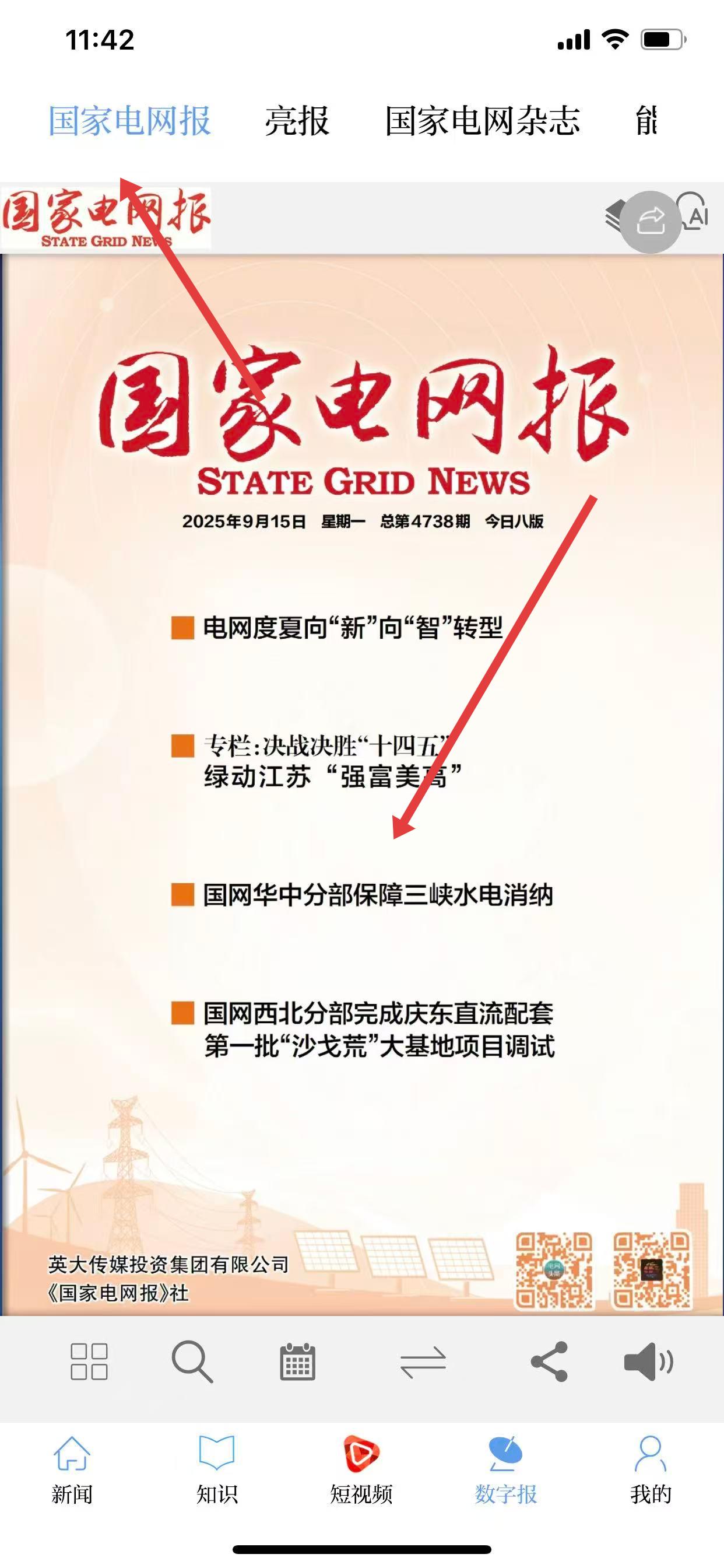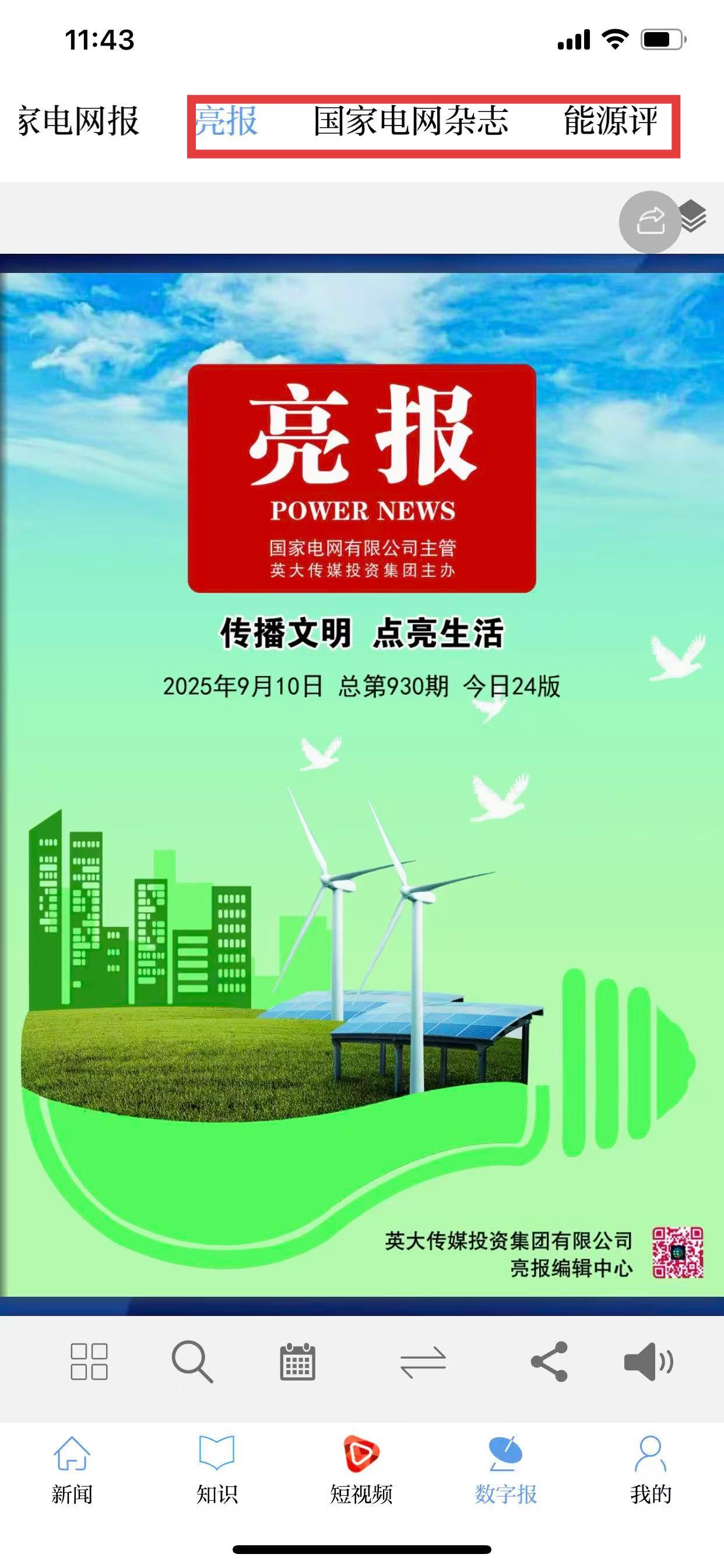 1、打開(kāi)電網(wǎng)頭條App,進(jìn)入首頁(yè)后,點(diǎn)擊底部導(dǎo)航欄中的數(shù)字報(bào)選項(xiàng)。