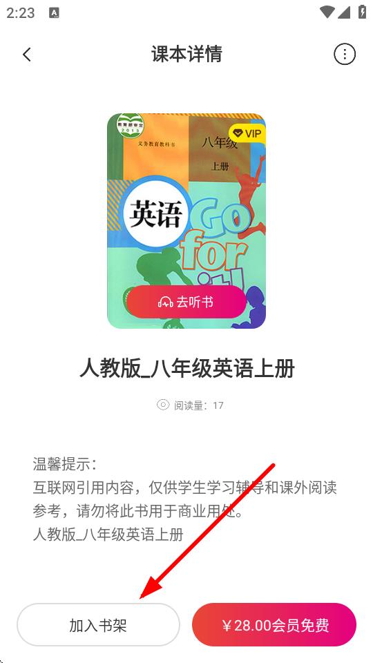 4、在課本詳情頁面,點擊加入書架,完成書本添加到書架的操作。