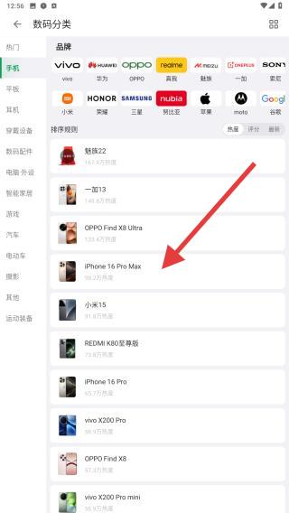 2、在數(shù)碼分類頁,通過品牌蘋果、華為等或品類手機(jī)、平板篩選,點(diǎn)擊具體機(jī)型如圖中iPhone16ProMax進(jìn)入詳情頁。