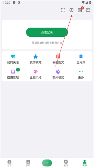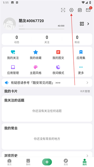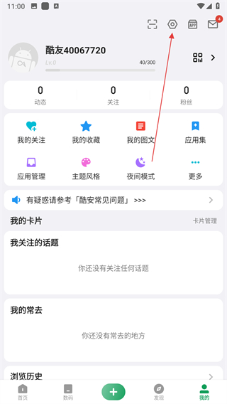 1、打開酷安APP,點(diǎn)擊右上角設(shè)置圖標(biāo),進(jìn)入設(shè)置頁面。
