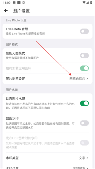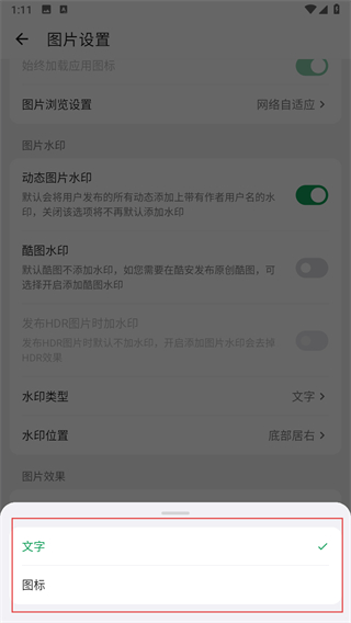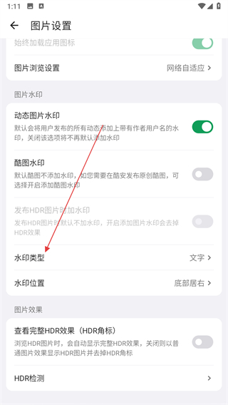 3、在圖片設(shè)置頁面,找到水印類型選項(xiàng),點(diǎn)擊該選項(xiàng)彈出選擇窗口。