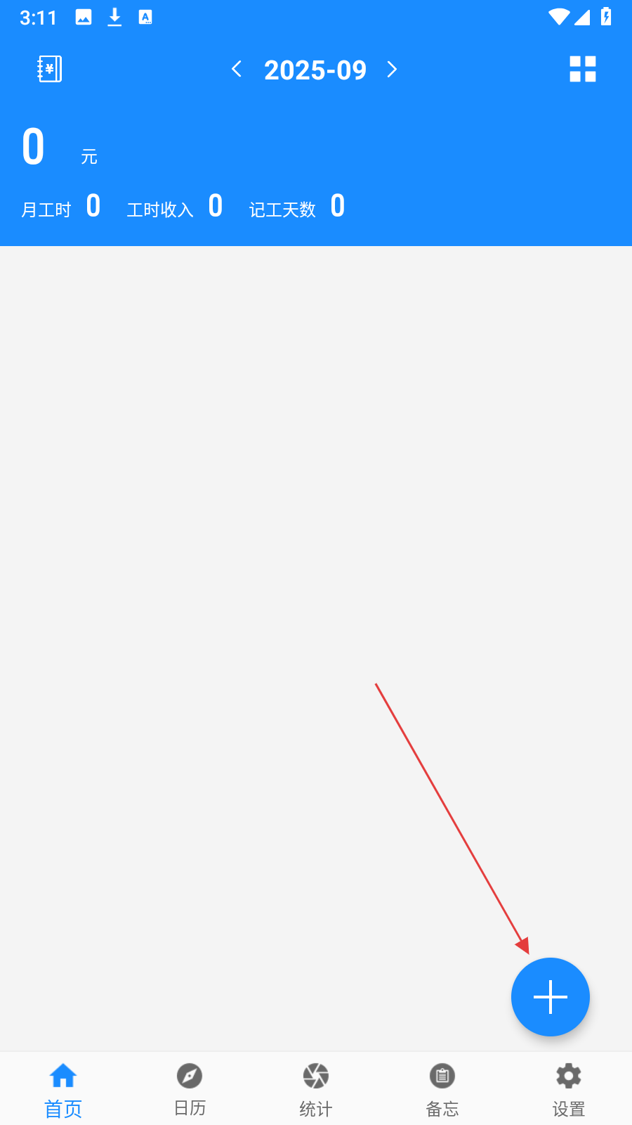 1、打開(kāi)小時(shí)工工時(shí)記應(yīng)用,在首頁(yè)點(diǎn)擊右下角藍(lán)色+按鈕,進(jìn)入工時(shí)記錄頁(yè)面。