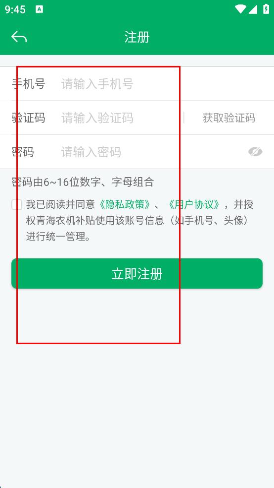 4、在注冊頁面,依次輸入手機號、驗證碼以及設(shè)置密碼,勾選我已閱讀并同意隱私政策、用戶協(xié)議點擊立即注冊按鈕,完成注冊操作。