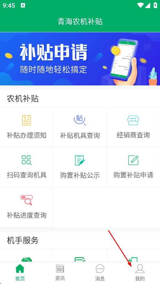 1、打開青海農(nóng)機補貼軟件,進入首頁后,點擊右下角我的選項,進入個人頁面。
