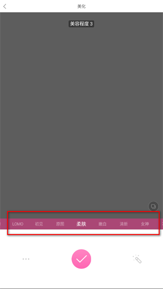 2、在美化頁(yè)面,選擇目標(biāo)濾鏡如柔膚、清新、女神等。