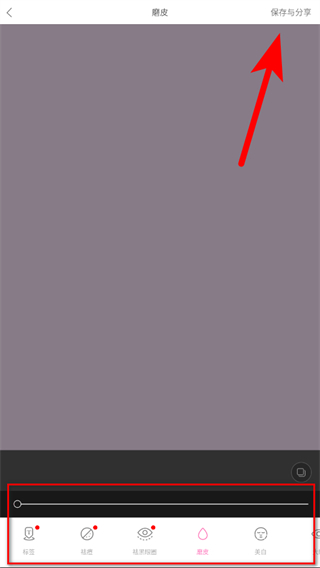 4、調(diào)整磨皮、祛痘、祛黑眼圈等參數(shù)后,點(diǎn)擊右上角的保存與分享按鈕,即可完成圖片美化操作。