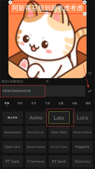 5、在該頁面內(nèi),輸入文字內(nèi)容以及選擇好字體后,點(diǎn)擊打鉤即可。