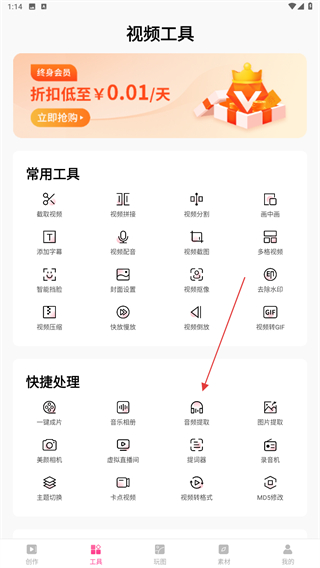 2、進(jìn)入視頻工具的頁面內(nèi),點(diǎn)擊音頻提取的功能按鈕。
